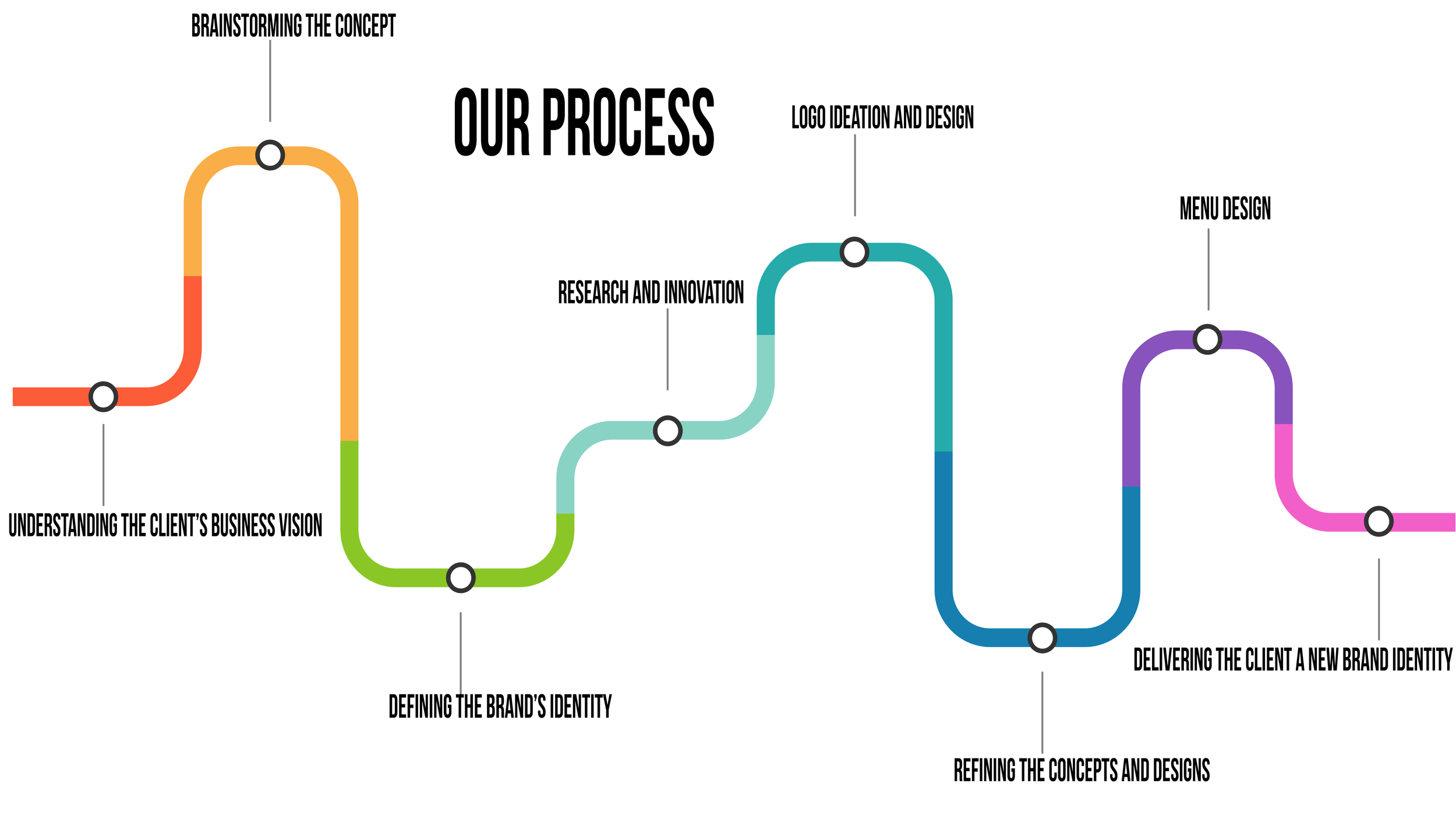 We spoke with the client to get a sense of the type of food being served. The client stated that each dish was nontraditionally prepared and included nontraditional ingredients that reflected important people and places in the U.S. The restaurant is new so the menu is paired down and we decided to reflect that simplicity in the layout of the menu. We used geometric shapes with a simple color pattern that reflected the colors in the logo. We wanted the menu to be legible, visually clear, appetizing by adding drawings of the food ingredients.